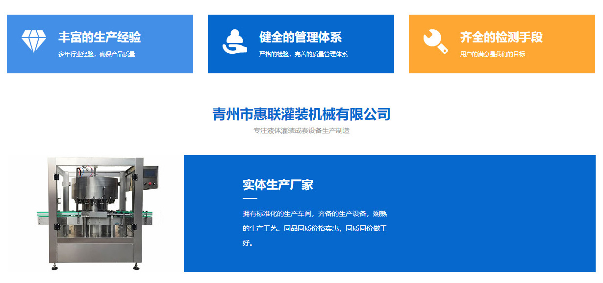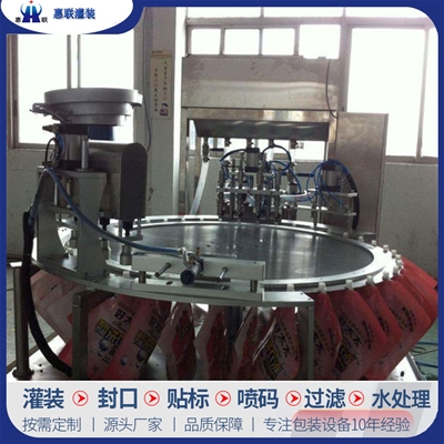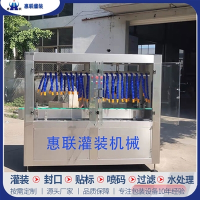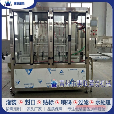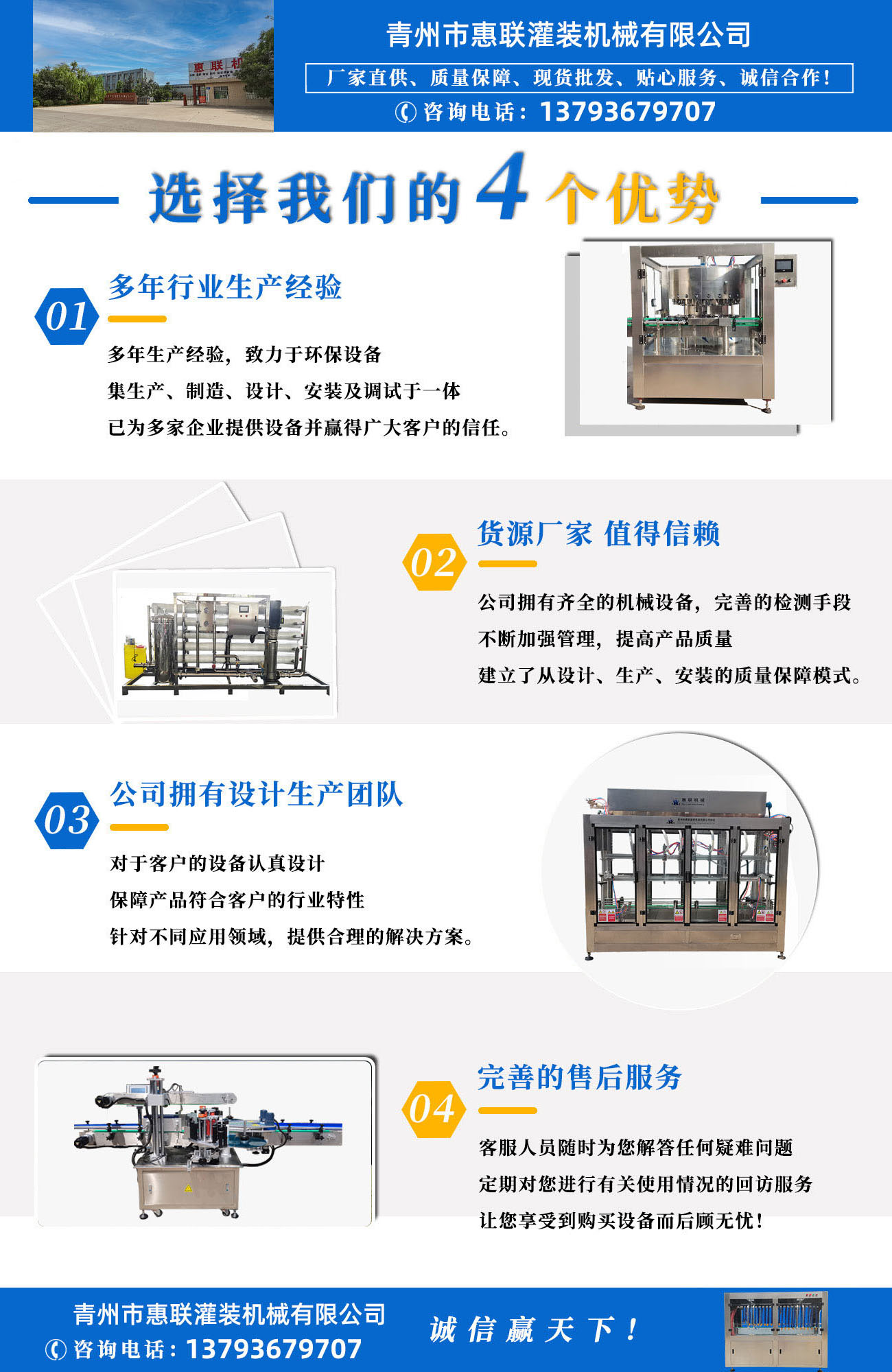 青州市惠聯灌裝機械有限公司是一家集生產研發(fā)、銷售、服務于一體的液體灌裝成套設備生產企業(yè),可根據廠家要求設計合理液體灌裝生產線,為用戶提供技術咨詢、設計工藝、場區(qū)平面布置、工藝改造、設備安裝調試等完善服務。 公司生產制造各種類型液體灌裝機、過濾機,水處理設備及液體灌裝成套設備。主要產品有:白酒、葡萄酒、黃酒等酒水灌裝機、食用油、機油、潤滑油等油類灌裝機、醬油醋、老抽、生抽等調味品灌裝機、防凍液、玻璃水灌裝機、酒精、84消毒液灌裝機、車用尿素灌裝機、口服液灌裝機、洗滌劑灌裝機等多種液體、膏體灌裝設備,全自動/半自動灌裝機型號多,規(guī)格全,洗瓶機、瓶子封口機、打塞機、熱縮機、瓶子烘干機、貼標機、噴碼機、輸送線、裝箱機、水處理設備等全套生產線相關配套設備齊全,自產自銷,一站式購齊,售后無憂。